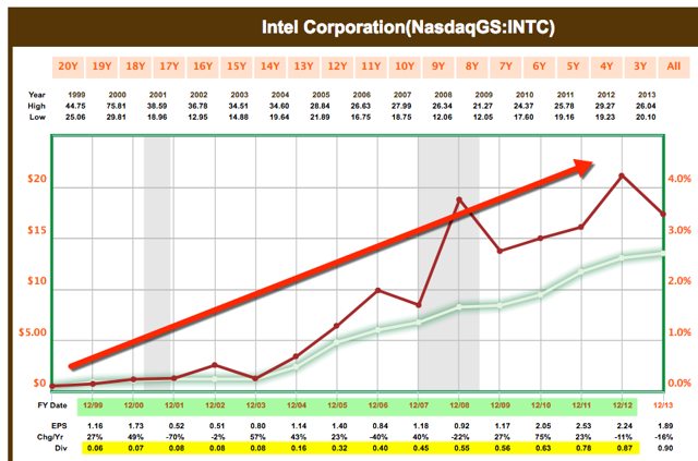Since INTC"s earnings weren"t growing, this "growth" was somewhat artificial. The payout ratio in 2000 was about 5%, then 15% in 2001, then 23% in 2005, then 48% in 2009 and then around 40% in 12.