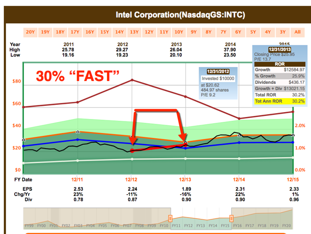 If you believe that Intel is more likely to float around the 10 year average P/E that"s between 12 and 13, then your annual rate of return drops to around 6%. And really, considering the spike today, it"s more like 5%.