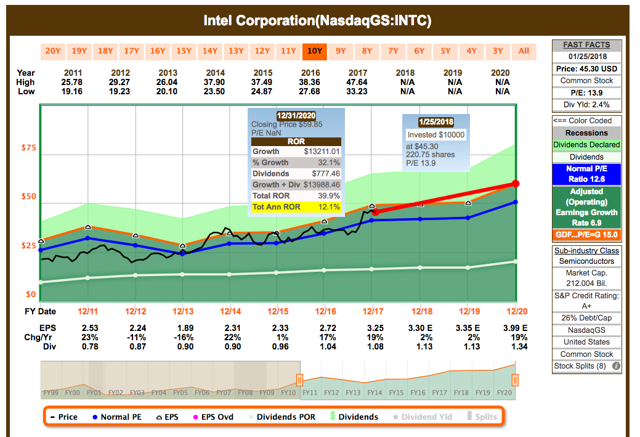 So, if you"re "into" the momentum and the growth story, then you"re probably looking at something like a 12% rate of return through 2020, assuming Intel"s P/E moves to up around 15. Although, after the spike today, I"d have to revise that down to probably 10-11% per year.
