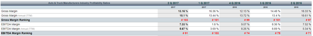 • Even if one were to make EBITDA a primary criterion, note that the 8% EBITDA number is what an AVERAGE auto manufacturer delivers with an average gross margin of around 15% (see image below)