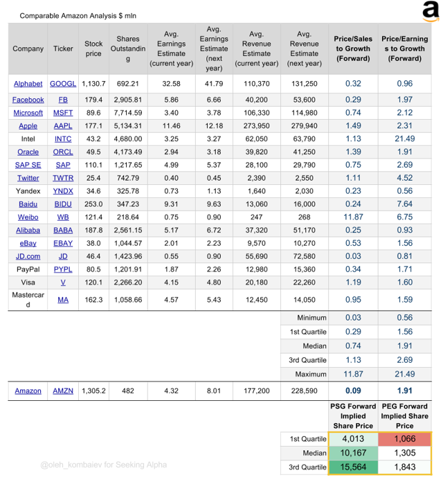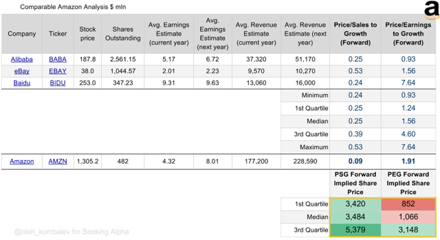 In this situation, it would be reasonable to compare Amazon through the multiples previously adjusted for the expected growth rate. That is, I suggest to compare and evaluate Amazon through the P/E (forward) and P/S (forward) multiples divided by the expected growth rates. The higher is the growth, the lower are the value of each multiple and the relative value of the company. In this case, we compare the dollar evaluation of each percent of the future company’s revenue and profit growth. Here I provided the detailed description of the formulas.