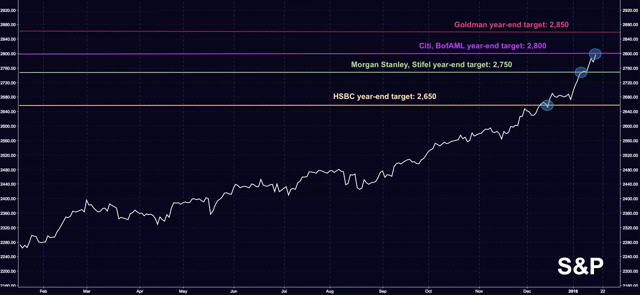 Much harder than predicting that over the long-haul stocks rise, is predicting how much stocks will rise over shorter horizons or, if the horizon is short enough, if they might even fall. This is where the effort to predict where stocks, as an asset class, will be a month, a year, or even five years from now, breaks down entirely. And the thing is, I"m not trying to malign the people whose job it is to try and make those predictions. It"s just that what they"re tasked with doing is impossible, so what you end up with are scenarios where markets blow through nearly 50% of the Street"s year-end targets in the first four weeks of the year, which is what happened in January. Here"s a fun chart that shows you how Wall Street"s year-end S&P targets were holding up as of January 17: