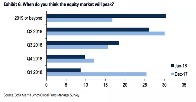 That"s from BofAML"s global fund manager survey, and as you can see, the percentage of respondents predicting an equity market peak in Q1 fell materially from the December survey to the January survey because, well, because if what you were going by was January, well then the S&P looked like it might be on its way to 10,000 (that"s a joke, but you get the point).