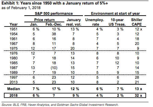 By focusing on 1987, investors overlook other historical episodes that suggest a much better outlook for US equities in 2018. Of the 12 other years since 1950 that started with a January return greater than 5%, 1987 is the only one in which the February-December return was negative. Across all episodes, the median 11-month return was 17%.
