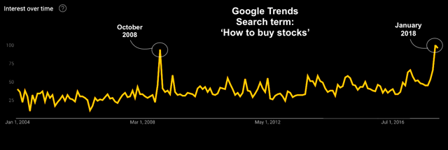 Some folks were trying to figure out how to buy stocks in January, and although drawing conclusions from Google trends charts is of course a silly thing to do, it"s worth noting that the last time laypeople were this interested in getting in, there actually was a meaningful dip, whereas that spike in January came at a time when the market was going up literally every, single day.