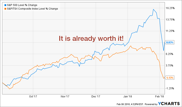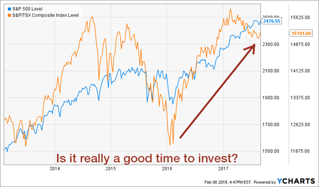 Over the past 5 years, the S&P 500 almost went up all the time. There were two small speed bumps in 2015-2016, but it quickly bounced back. As for the Canadian market, it was a little bit more complicated. The oil bust and the low prices of commodities slowed down investors" enthusiasm. While there were some fluctuations, the TSX was still up, though... So, as many readers of this blog were telling me to wait and see where the market would go back in September, I decided to invest all my money by the end of the year. Interestingly enough, even after the small market correction (which has already disappeared), it was worth it: