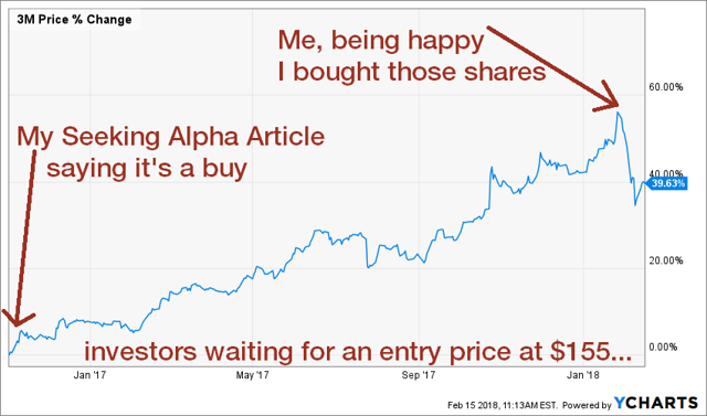 I like to use 3M Co. (NYSE:MMM) as an example to illustrate how waiting is bad for your portfolio. I wrote an article about the company back on November 2, 2016, here. If you look at the comments, many investors adept at using F.A.S.T. Graphs were saying the entry point for MMM was $155 (the stock was trading around $165 back then). Then, many investors are waiting to catch MMM at $155, while I bought it around $165.