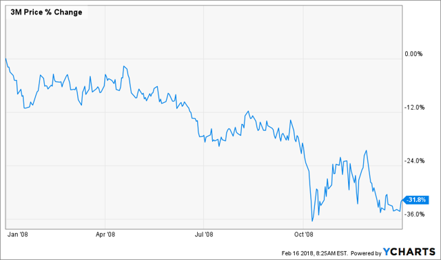 The outcome here is catastrophic. Waiters lost a 40% loss on their investment. Even worse, they missed $6.06/share in dividend (assuming you missed the November 2016 payments). At $165 per share, this represents 3.67% of your investment. But there"s more to the catastrophic story. MMM is currently trading around $235 (as at February 16th when I wrote this article). In order to drop back to $158.94 (the November stock price of $165 minus dividend paid), the stock must lose 32% of its value. While this is possible, it is very unlikely. As you can see on the following graph, MMM stock dropped by -31.8% (wow... it"s like I"m making numbers up!) during the worst market crash ever: