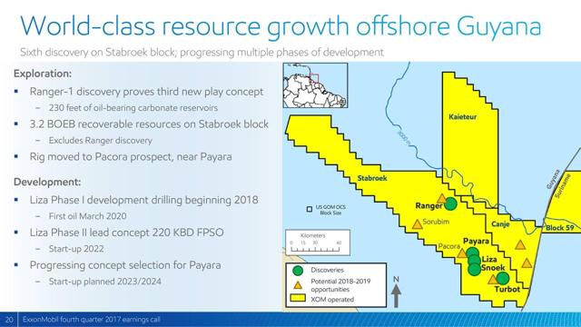 Discoveries offshore Guyana are now estimated to total more than 3.2 billion recoverable oil-equivalent barrels. Guyana will be a major driver of Exxon"s future production growth. At its 2017 Analyst Meeting presentation, Exxon gave guidance for annual production to rise to 4.0-4.4 million barrels per day by 2020.