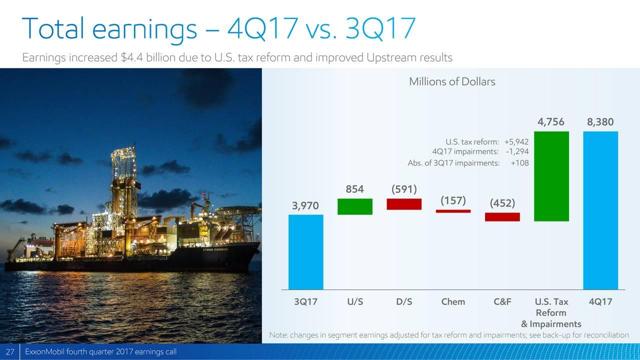 Tax reform was a major benefit to both companies. Operationally, upstream activities, primarily exploration and production, performed very well for both Exxon and Chevron. Not surprisingly, this was due to rising oil and gas prices. Exxon"s fourth-quarter earnings excluding U.S. tax reform and impairments increased $1 billion to $2.5 billion, driven by higher prices, as realizations increased more than $10 per barrel.
