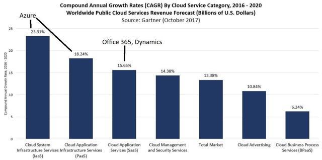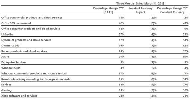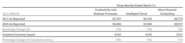 Microsoft"s top line grew at an impressive rate in Q1 2018 (its fiscal Q3) led by strong increases not just in cloud but also its productivity and business segment (subscription services for consumers and enterprises). However the main growth catalyst for Microsoft remains its cloud infrastructure as a services or IaaS business.