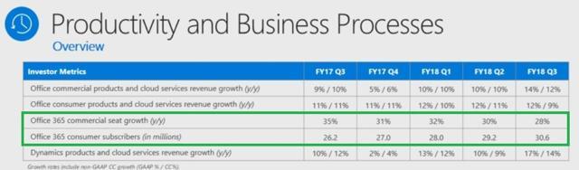 Microsoft"s Office 365 is the most feature rich application suite for word processing, spreadsheets, and presentations, and the company continues to grow its subscriber base at a rapid clip (28% in commercial and 17% consumer). In fact according to Nadella Office 365 commercial now has 135 million global subscribers.