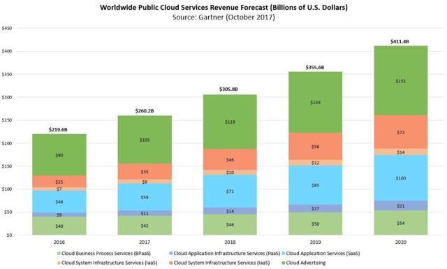 And as impressive as Microsoft"s cloud growth has been it"s just the tip of the iceberg. That"s because the future of enterprise IT solutions is firmly in the cloud. In fact by 2020 analyst firm Gartner expects that the cloud computing market will total $411 billion in size and will be growing at 16% to 23% per year (in the parts Microsoft operates in).