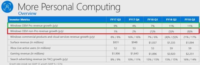 However as you can see the consumer windows OEM business has been seeing accelerating declines in the past three quarters as global PC sales decline due to consumers shifting more to mobile platforms. But there is some good news, and I"m not talking about the strong growth in Windows Pro OEM that is partially offsetting the decline in the retail side. Nor am I referring to the surprising strength of the company"s hardware division (Xbox and Surface) or advertising revenue from Bing.
