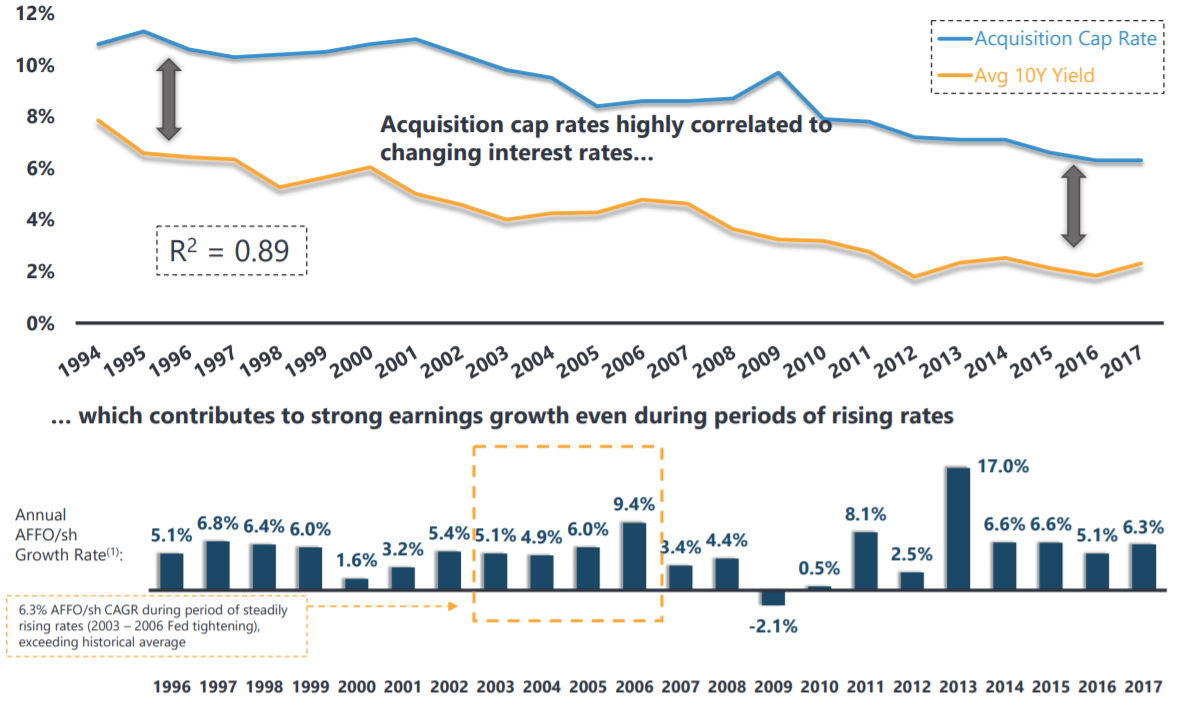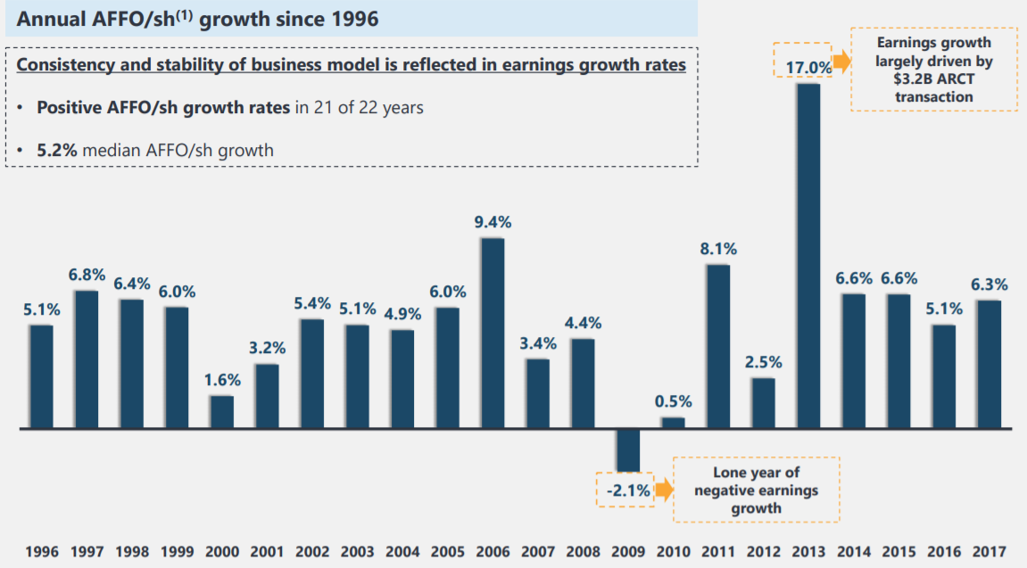 For instance, from July 2004 until June 2006, the Federal Reserve hiked interest rates from 1.25% to 5.25%. Anyone would agree that this was a very material increase that is unlikely to recur anytime soon. And yet, Realty Income managed to grow its AFFO per share by ~6% per year even then.