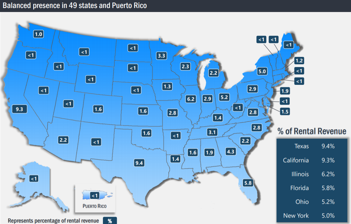 Realty Income owns a very diverse portfolio of over 5000 properties spread across USA with strong tenant-level and sector-level diversification.