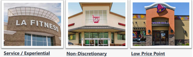 To reduce risk even further, Realty Income strategically invests in more defensive sectors which are expected to suffer little bankruptcies during recessions. This includes pharmacies, low price point fast food and fitness properties, for instance. The idea behind this allocation is simple: even in a bad recession, people will keep buying drugs at Walgreens (NASDAQ:WBA), go to get tacos from Taco Bell (NYSE:YUM), shop groceries at Dollar General (NYSE:DG), and keep working out at Plant Fitness (NYSE:PLNT), etc.