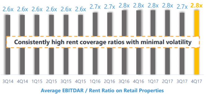 Finally, the selected properties benefit from very strong rent coverage ratios with minimal volatility. The profitability of the tenants is what makes or breaks a landlord in the long run. In the case of Realty Income, the risk of tenant bankruptcies appears minimal given that the company operates in defensive industries and generates plenty of cash flow to cover its rent payments.