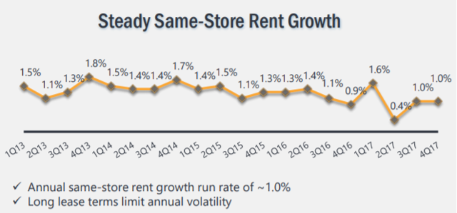 Realty Income is no “bargain”. In fact, some analysts argue that it is overvalued compared to peers. We agree that the company is far from being a “deep value” stock when it is trading at 16.5 times expected 2018 FFO; but when put into perspective, we find that the current share price has room for further long-term upside.