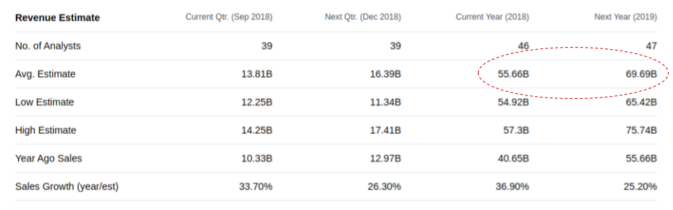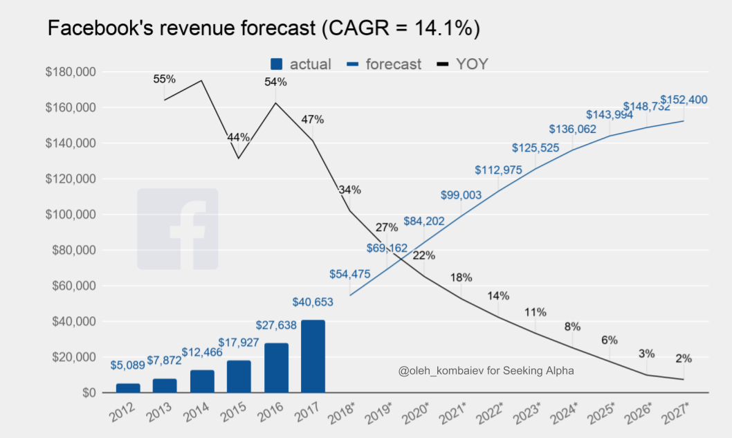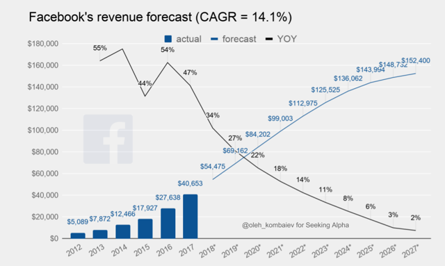 I would like to draw attention to the fact that my forecast assumes Facebook’s revenue of $54 billion in 2018 and $69 billion in 2019. Both figures are below current average analyst expectations: